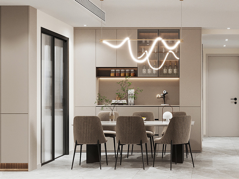 可以在用餐区设计餐边柜,或者直接使用成品餐边柜,收纳红酒、餐具、小家电,等等。如果采用餐厨一体化布局,可以将餐边柜和橱柜相结合,有利于从视觉上呈现空间整体性。