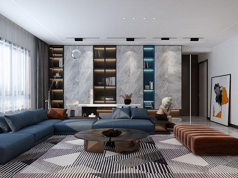 以黑白灰为空间的色彩基调,使用家具和软饰等的色彩和质感,并结合无主灯设计等,呈现宽敞明亮、时尚雅致的现代家居。