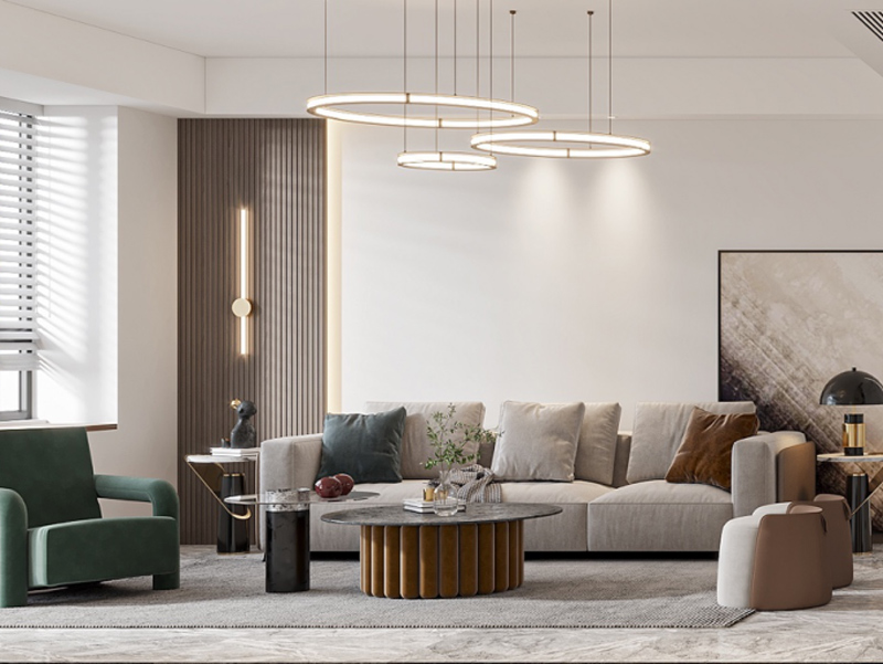 客厅区域采用较为简洁的背景墙搭配,格栅区域搭配暖色灯带,赋予空间层次感,避免单调冷清。