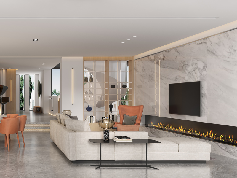 本案例风格定位于现代简约风,大理石基底搭配精致柔软的软装家具,错落有致使得整体更显品质感。
