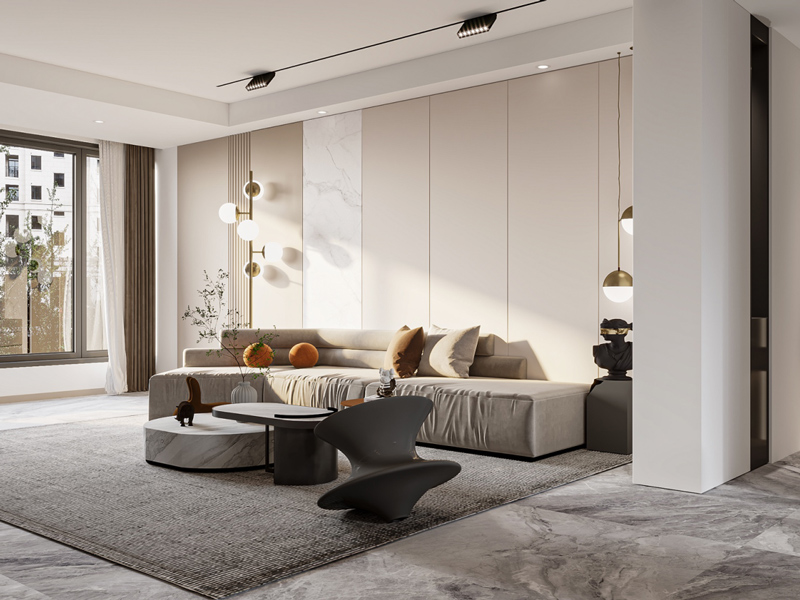 客厅整体设计较为简洁,拼接设计背景墙增强区域层次感,创意的家具选择让整体更显精致时尚。