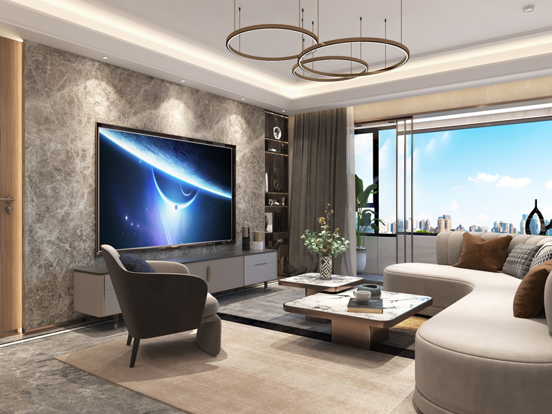 客厅采用整面大理石背景墙,营造别样格调空间气质,大面积窗体将自然光景纳入室内,明朗通透。