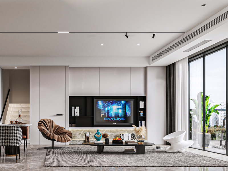 客厅大面积落地窗,充分满足室内采光需求,大气明朗,整体采用无主灯设计,通透和谐简洁清爽。