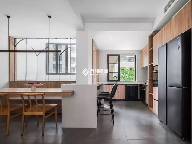 开放式厨房如果有承重柱无法拆除,可以围绕承重柱设计岛台,既能弱化承重柱的突兀感,还可以作为空间隔断使用。将岛台横向加宽还可以作为吧台使用,丰富厨房的功能。