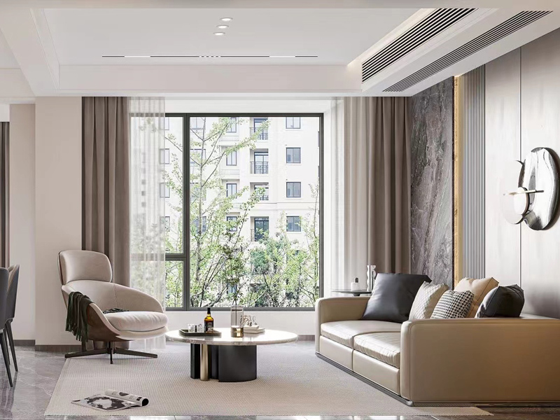采用落地窗引入自然光线,视野开阔,深色抱枕与大理石背景墙相呼应,家具摆放规整,形成舒适的休闲交流区域。